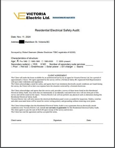 We offer a comprehensive 60 point independent Residential Electrical Safety Audit conducted by a Technical Safety BC certified BC Master Electrician. This audit covers every component of your homes electrical system from the wires coming in from the street to every outlet and installed equipment. The audit takes approximately 2 to 3 hours and at the end of the process our clients receive a detailed report with notes and photographs of any issues we discovered.